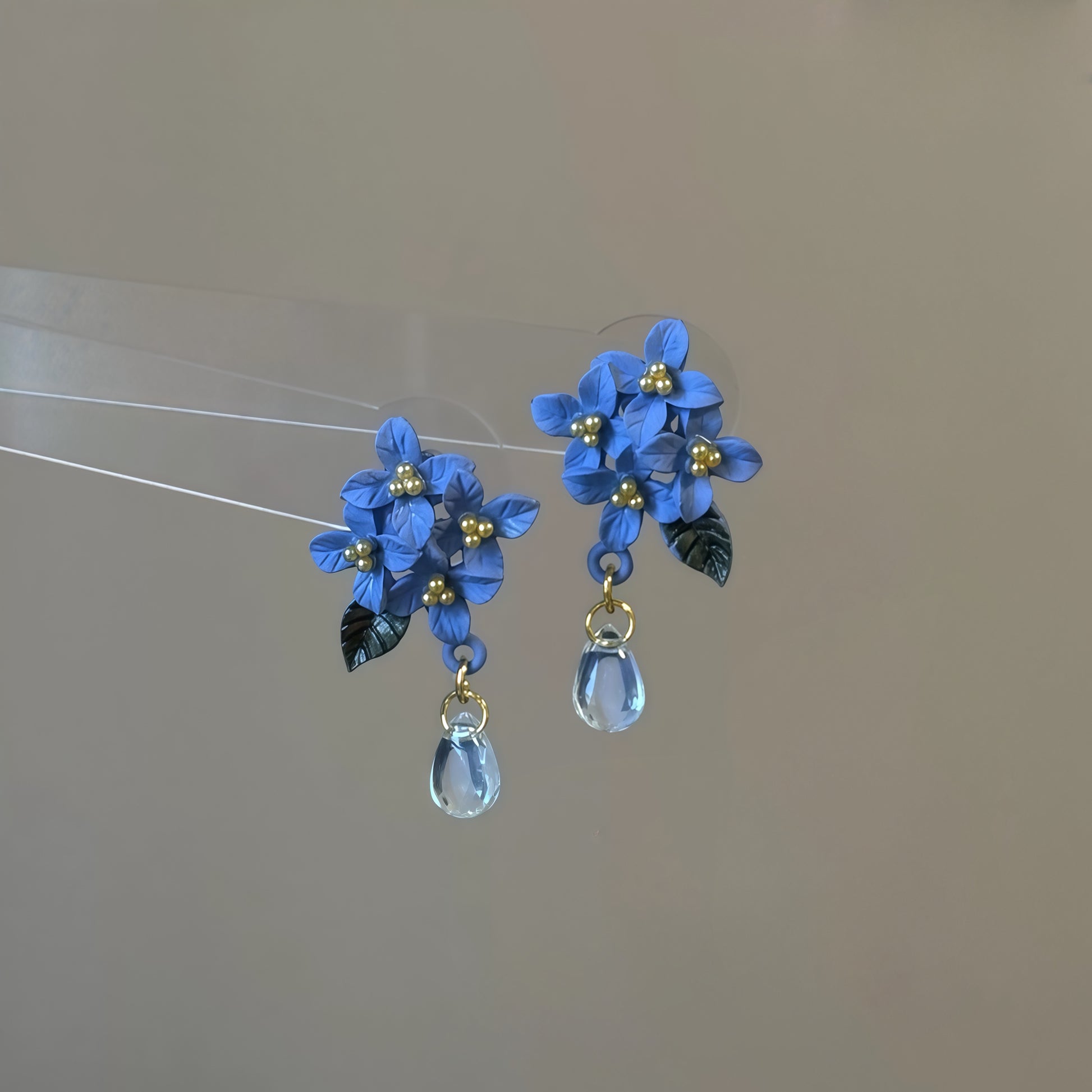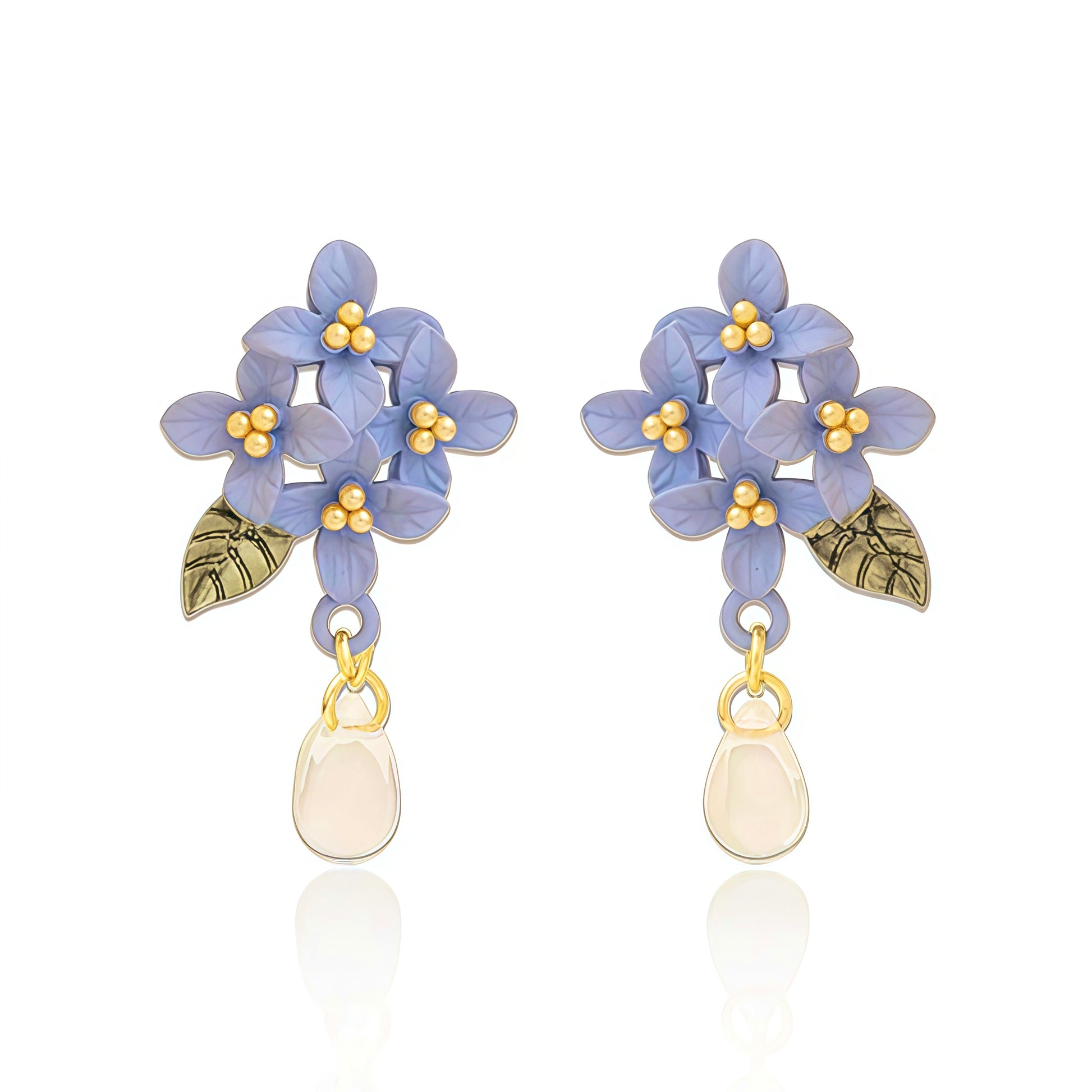 Omfavn forårets sarte skønhed med vores Blooming Hydrangea-øreringe, et statement-stykke, der indfanger naturens romantik i kunst, du kan bruge. Disse øreringe har klaser af håndskulpturerede, blå hortensiablomster i periwinkle-stil, fremhævet med gyldne perler i midten og en diskret grøn bladdetalje, der giver et naturligt og naturtro præg. Et dråbeformet krystalvedhæng dingler blidt nedenunder og fanger lyset med hver bevægelse for en elegant, æterisk glød.