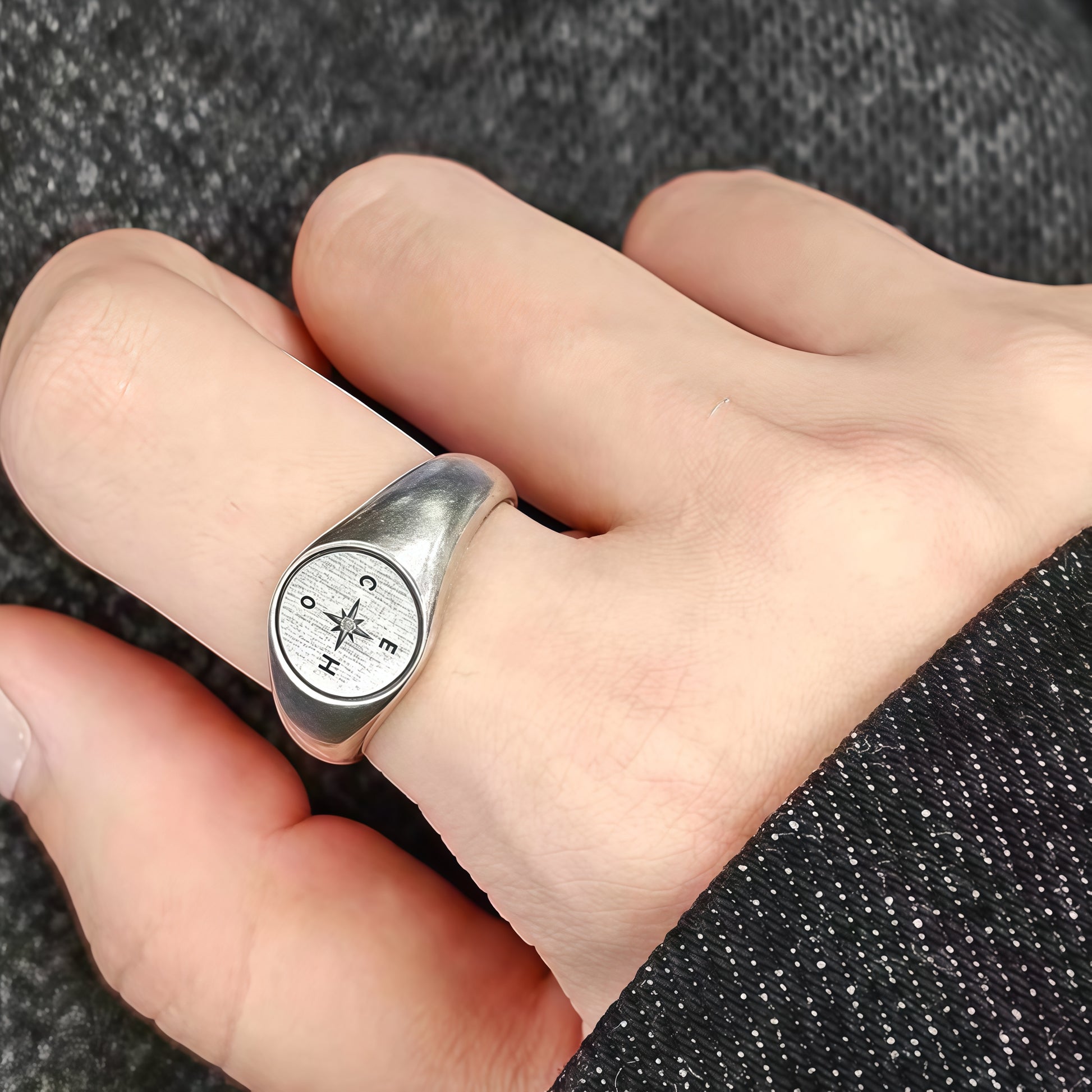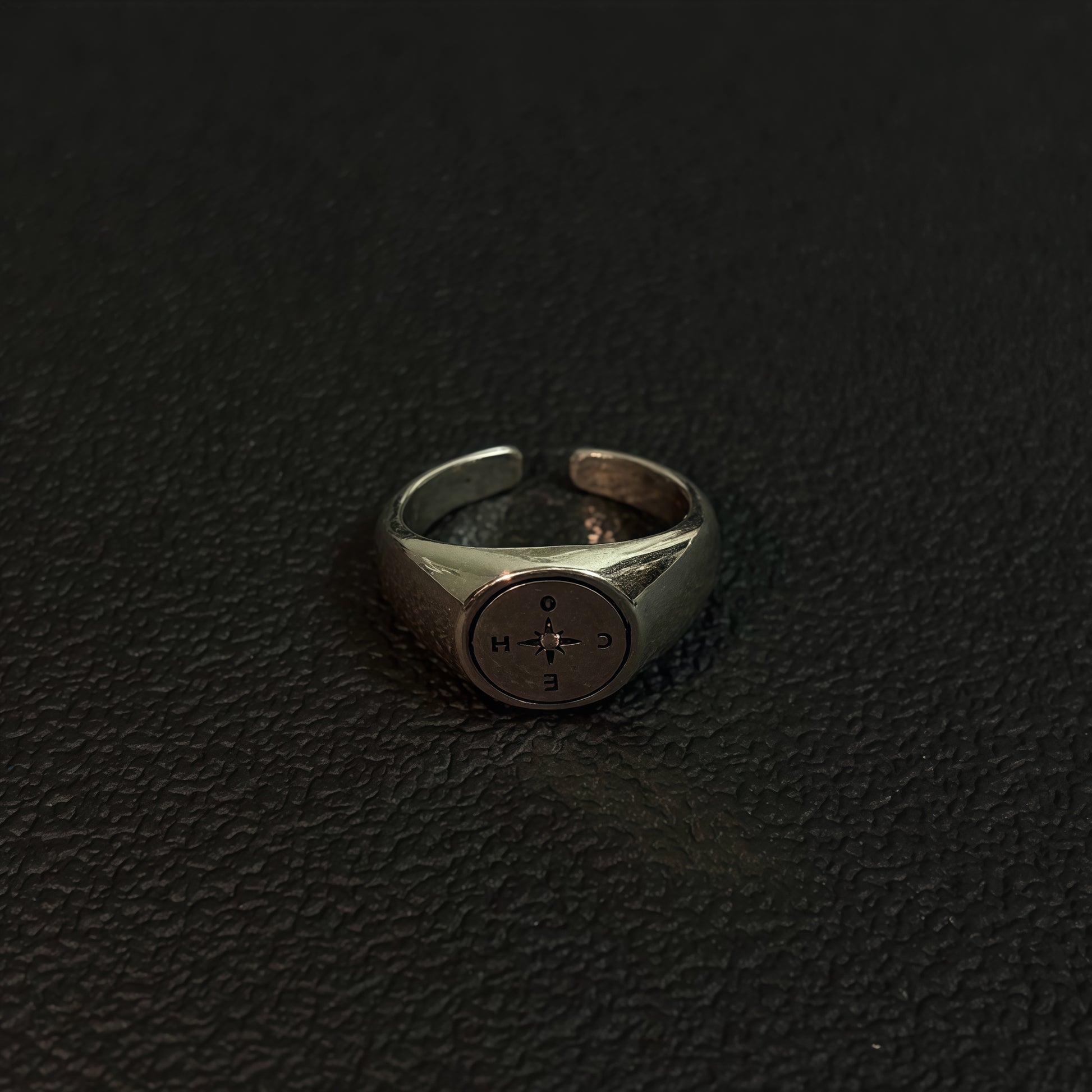 Crafted in high-polished silver-tone metal, its oval face features a finely engraved compass motif — a timeless symbol of direction and inner strength. The open-back design allows a comfortable adjustable fit, suitable for both men and women.