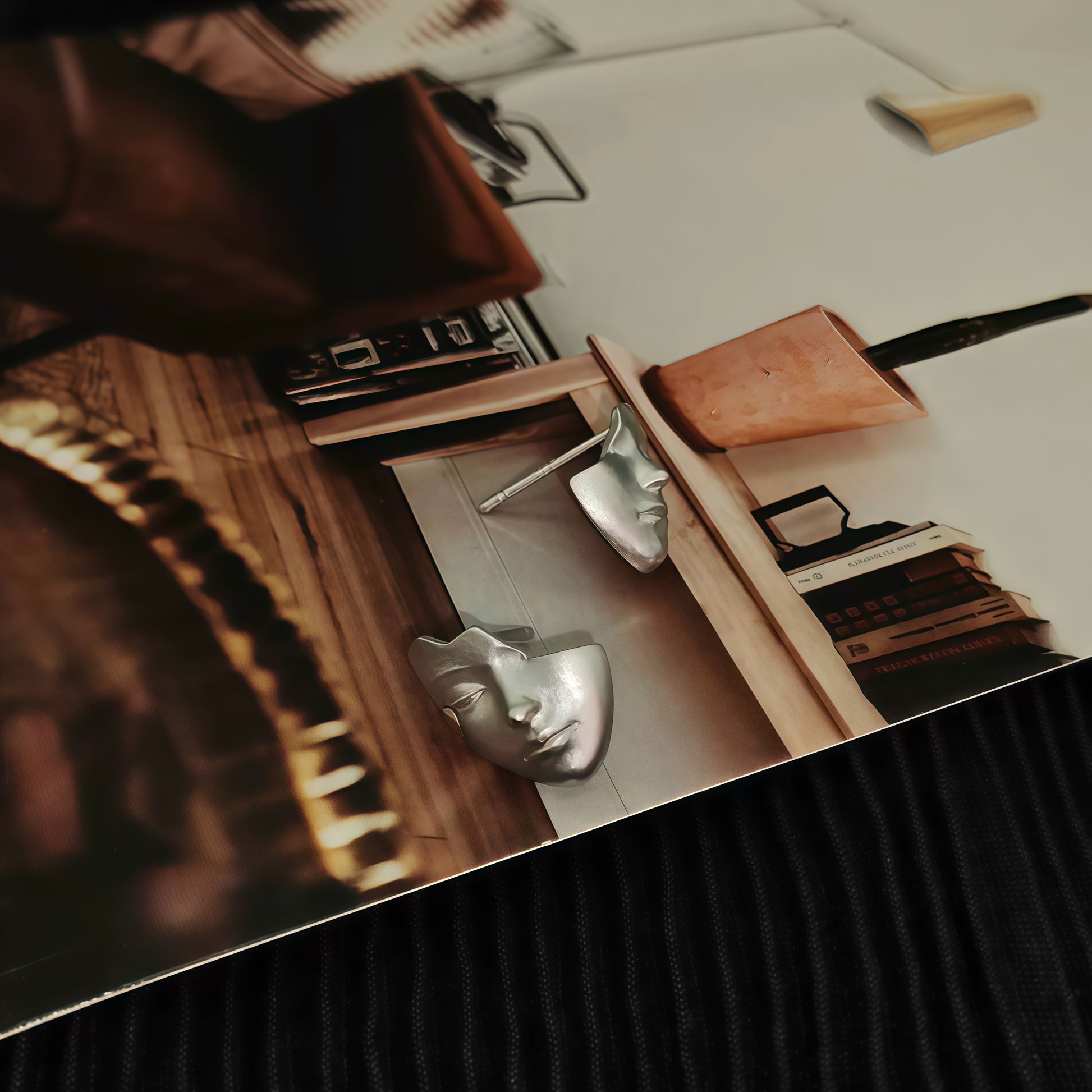 Each earring is shaped like a sculptural fragment of a serene human face — one calm, one gazing forward — symbolizing duality, introspection, and the quiet strength found within imperfection. The subtle golden detail at the temple glows like a moment of awareness — a reminder that light often resides in our most broken parts.