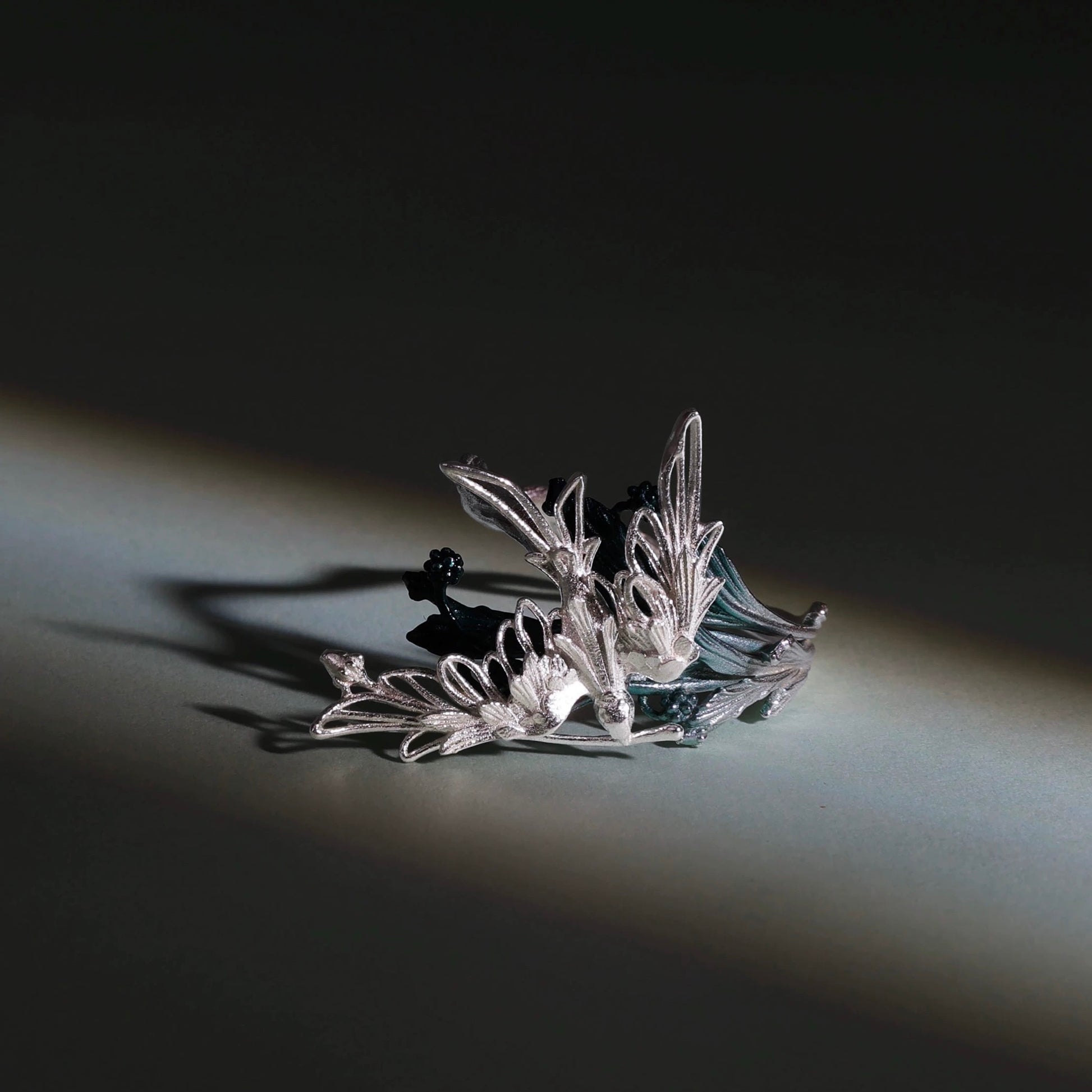 Graceful yet resilient, the swallow has long been a symbol of hope, love, and new beginnings. This handcrafted sterling silver ring captures the tender moment of a swallow in flight, carrying branches to build its nest — a timeless reminder of home, care, and the bonds that make life meaningful.