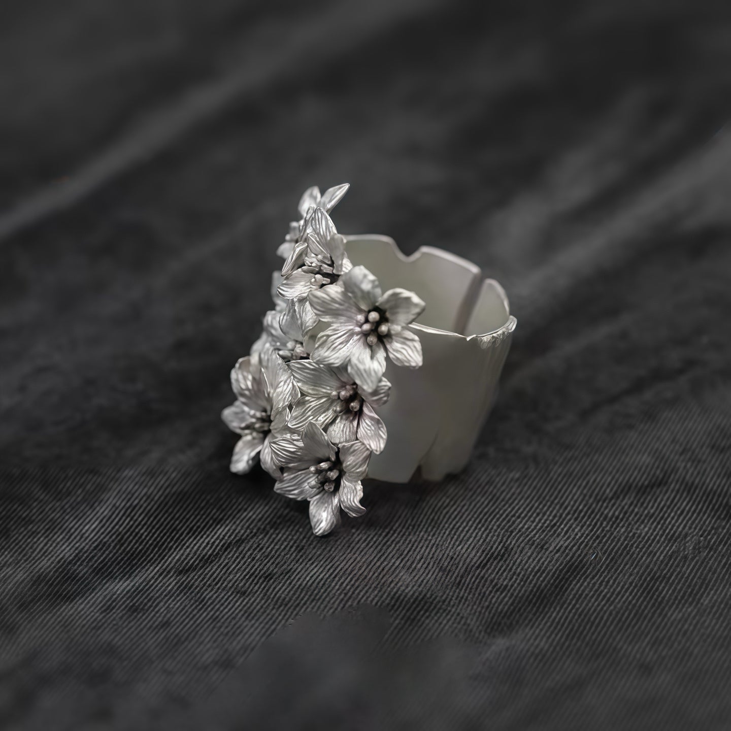 Crafted from sterling silver-plated brass, this statement piece radiates a soft sheen that complements both minimal and artistic styles. Its wide band and layered floral composition evoke the beauty of wildflowers thriving in unity — a reminder that gentleness and power can coexist.