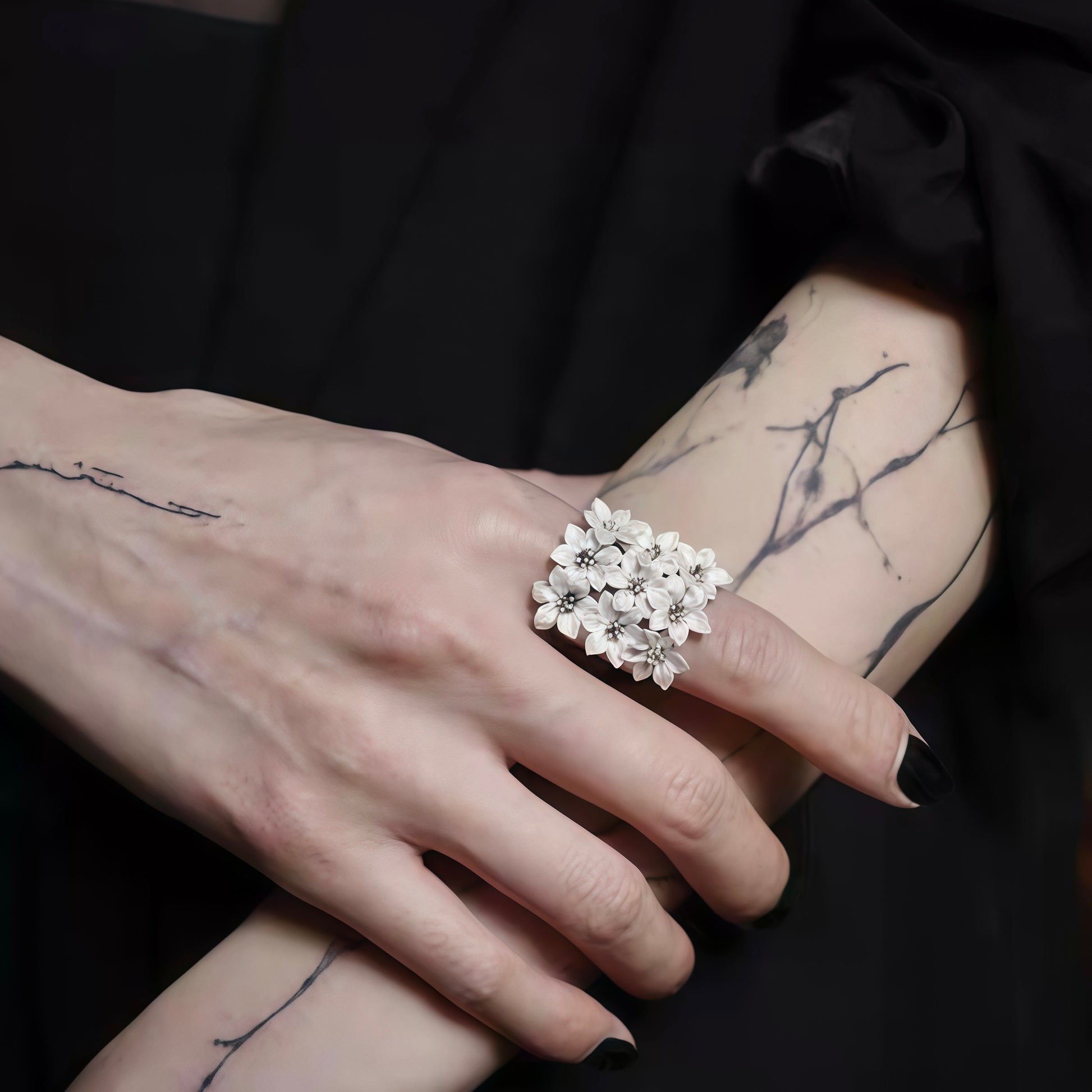 A poetic garden sculpted in silver. The Whispering Bloom Ring captures the delicate rhythm of spring frozen in time — a bouquet of hand-carved petals unfolding softly across your hand. Each blossom is intricately detailed, reflecting both fragility and strength — a wearable ode to nature’s quiet resilience.
