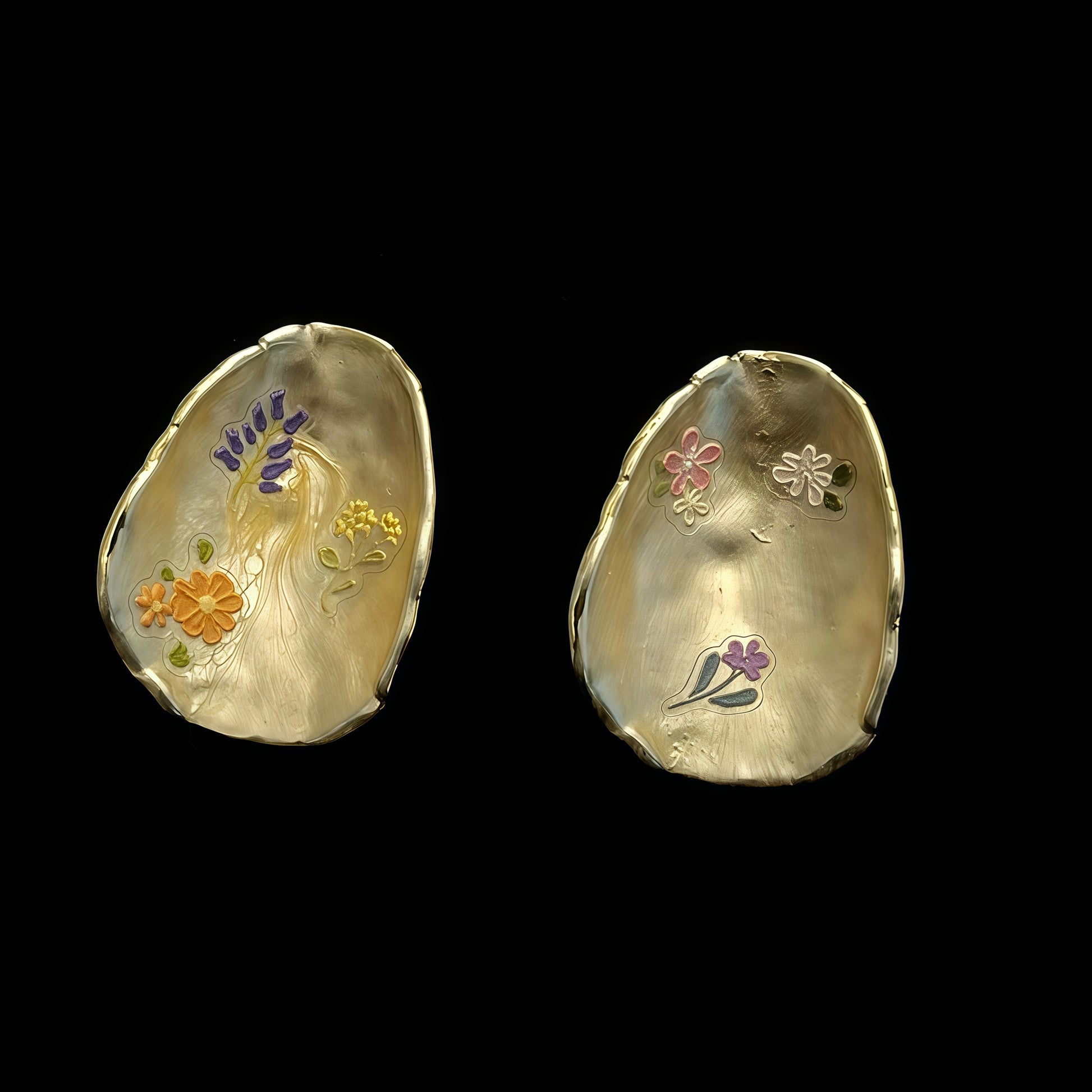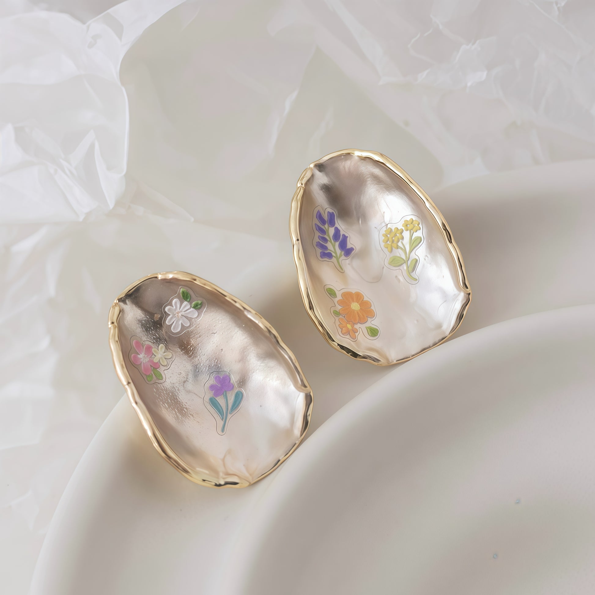 Crafted with a soft, organic silhouette and adorned with tiny painted florals, the Blooming Meadow Shell Earrings capture the quiet poetry of spring held inside a golden shell. Each earring is shaped like a natural, imperfect petal — fluid, asymmetrical, and softly gleaming — with delicate flowers painted in pastel colors: lavender sprigs, daisies, tiny blossoms and tender leaves.