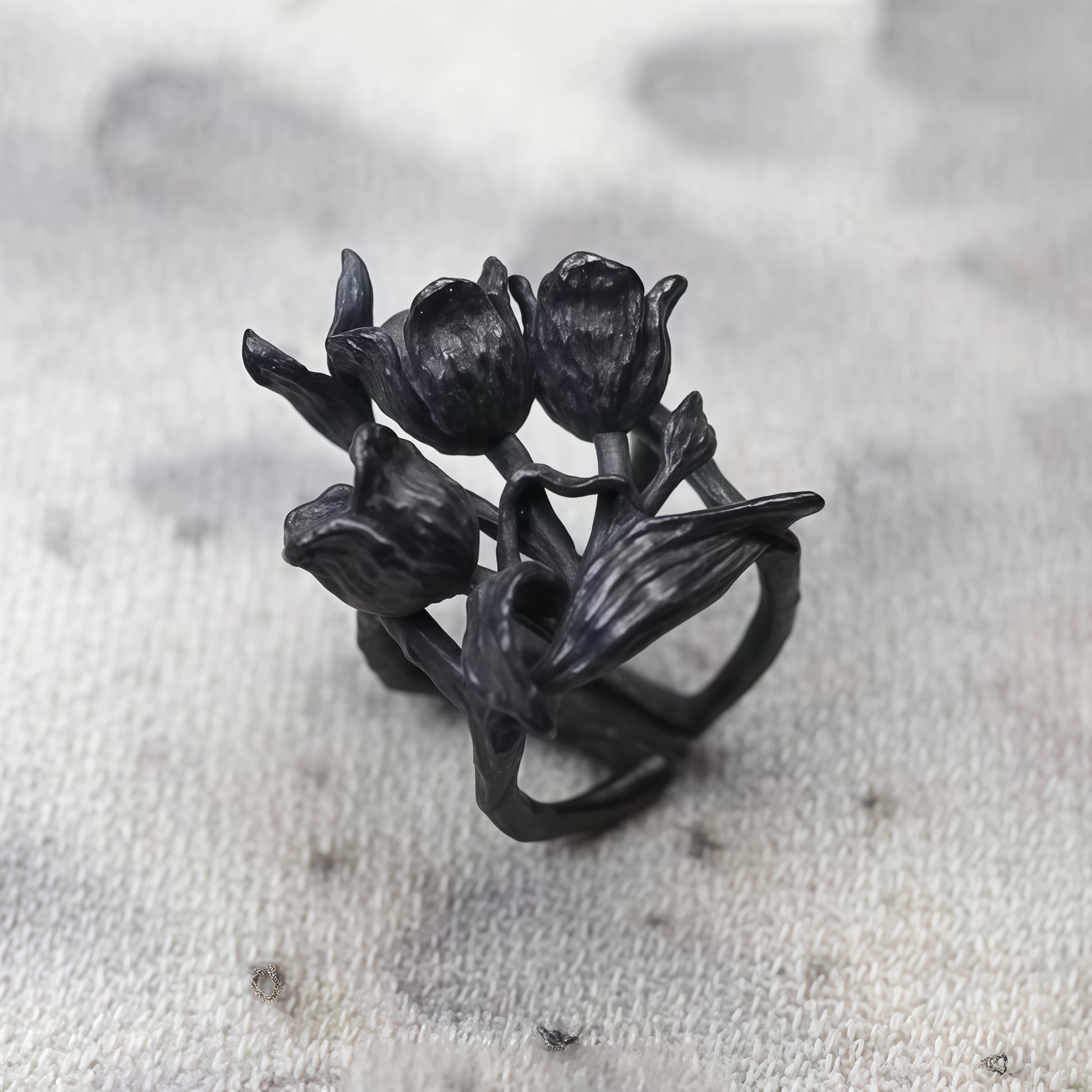 Each tulip bud is carefully carved with organic texture, layered leaves, and intertwined stems, forming a three-dimensional silhouette that feels both delicate and powerful. Whether in deep charcoal black or satin silver-white, the ring brings a poetic contrast to any look.