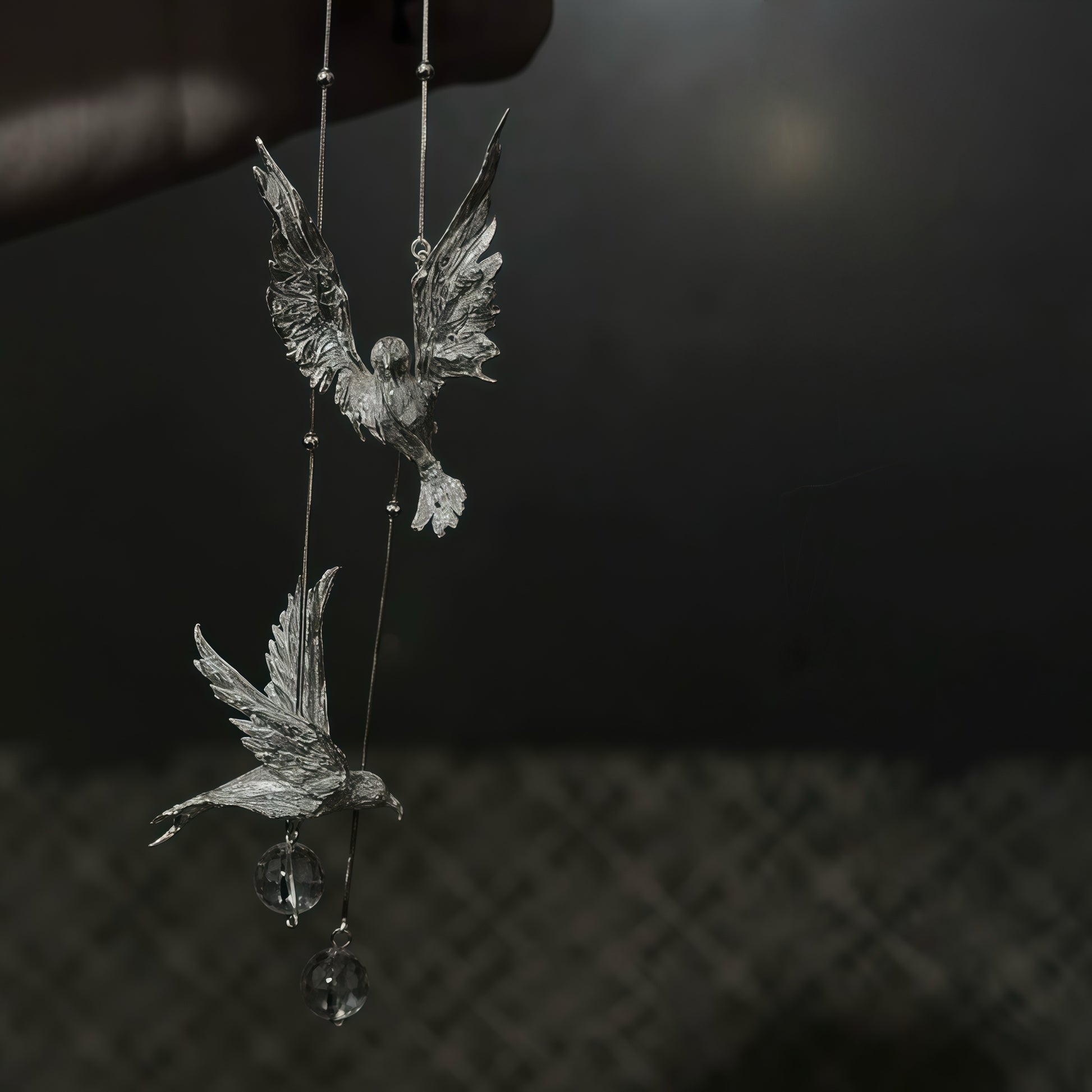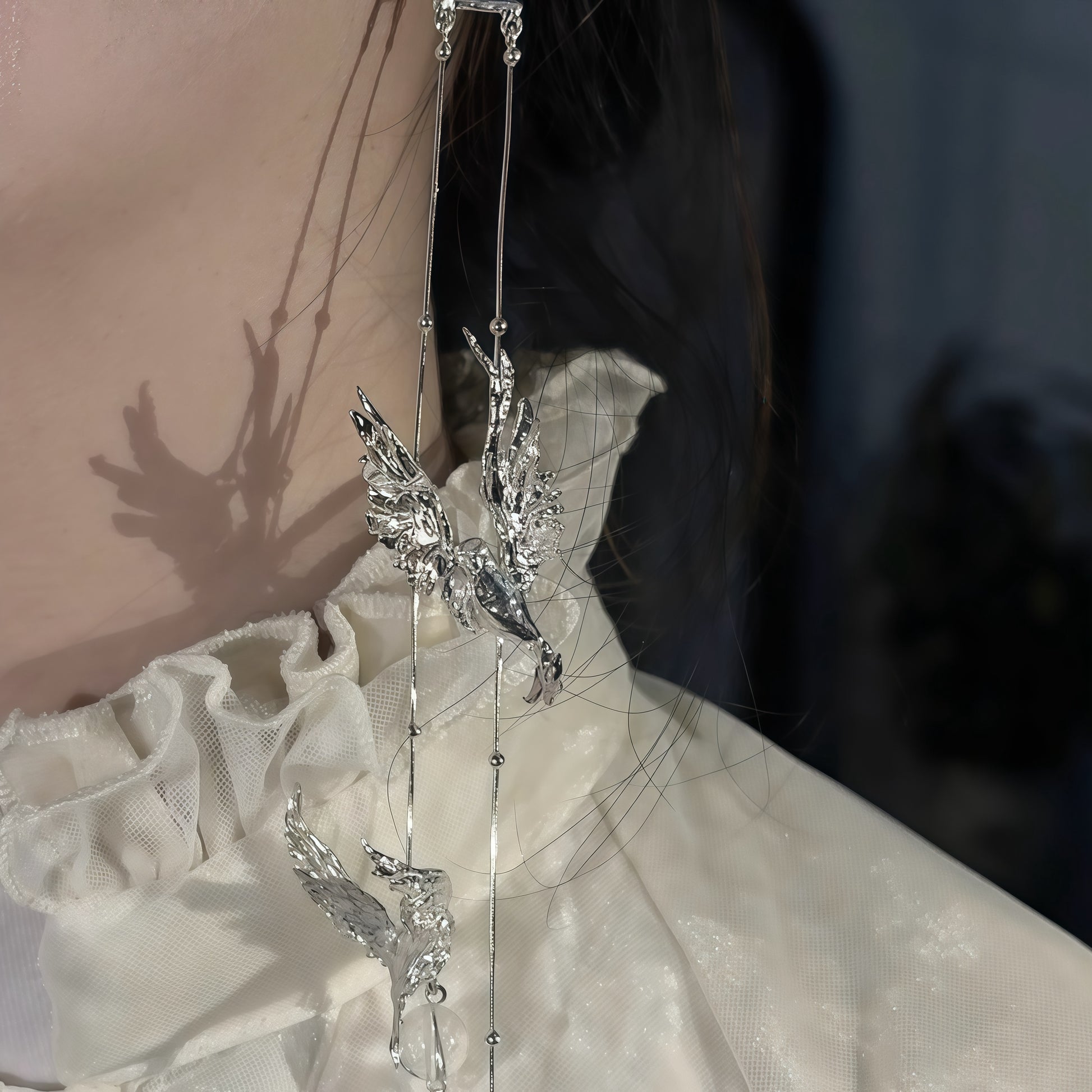 Each earring features two intricately sculpted birds mid-flight, their wings unfolding with lifelike detail. They are connected by fine silver threads and dotted with miniature spheres, creating a poetic sense of movement with every step. At the base, a clear crystal drop symbolizes purity and light — like morning dew carried through air.