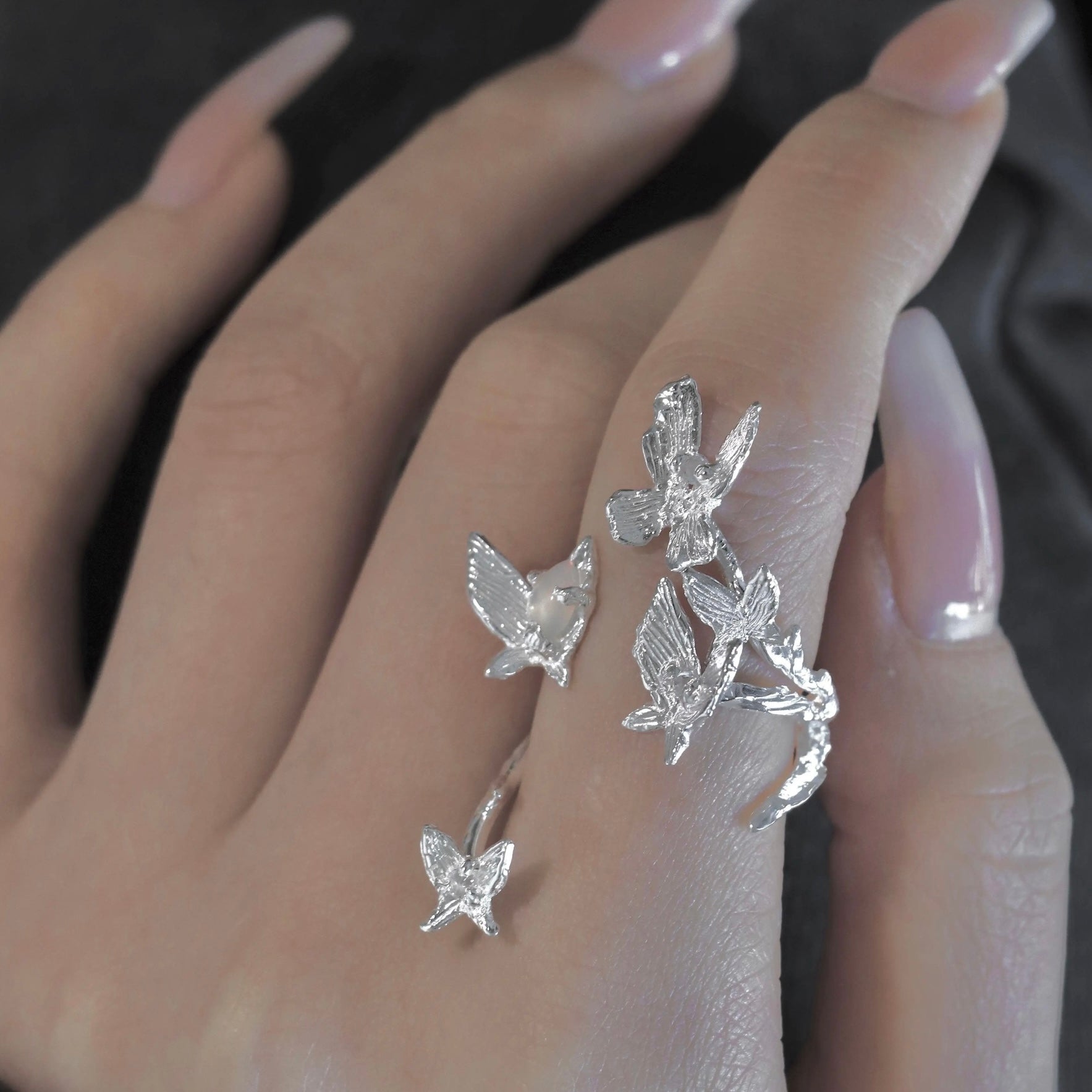 A poetic dance of silver wings — the Fluttering Light Ring captures the fragile beauty of butterflies mid-flight, frozen in a moment of eternal grace. Each delicate wing is meticulously carved to reflect light like morning dew, while the open design lets the piece wrap softly around your finger, just like nature’s gentle touch.