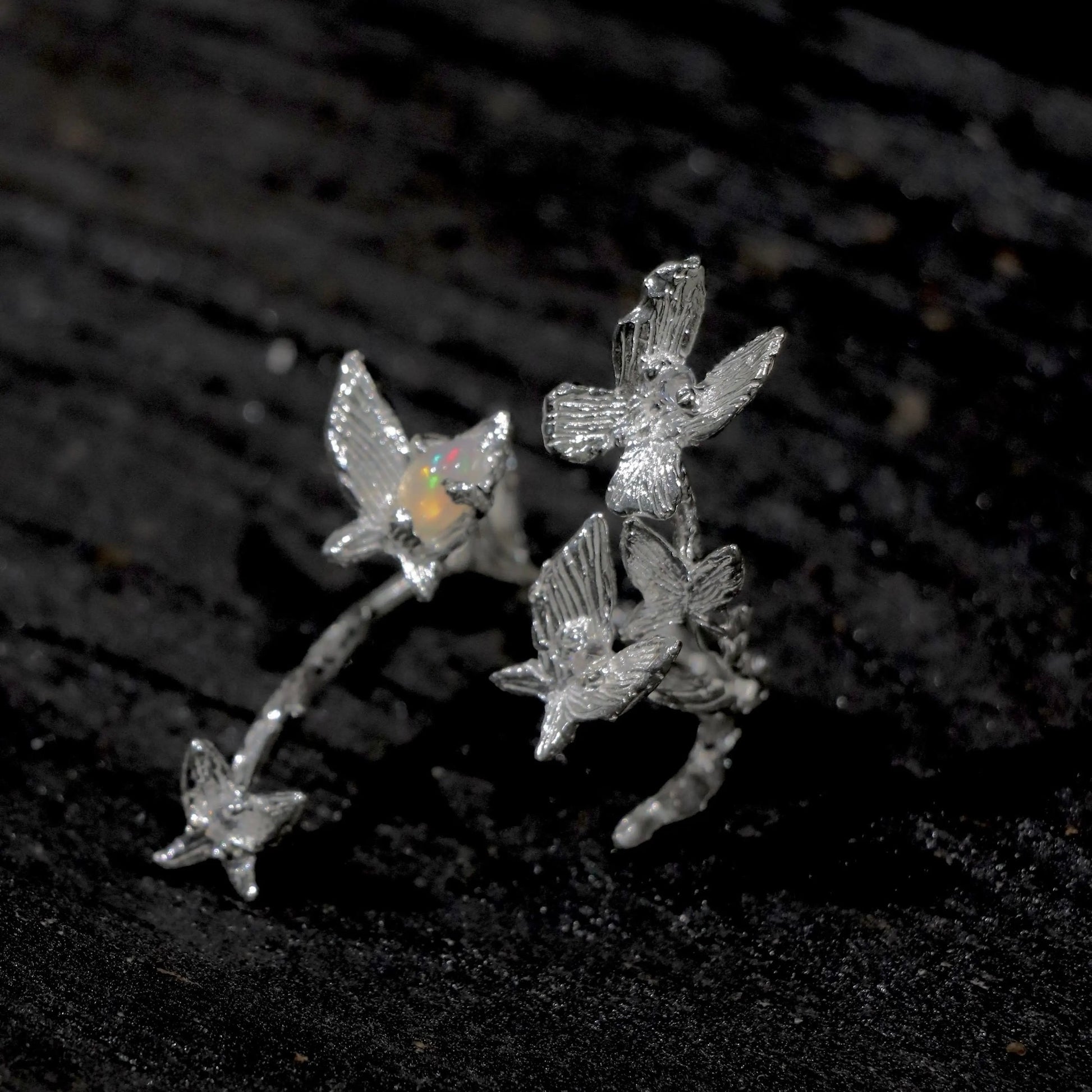 Crafted in sterling silver–plated brass, the ring combines texture and shine to create an ethereal yet contemporary look. A subtle opal detail glows at the heart of one butterfly, symbolizing transformation, hope, and the quiet strength found in change.