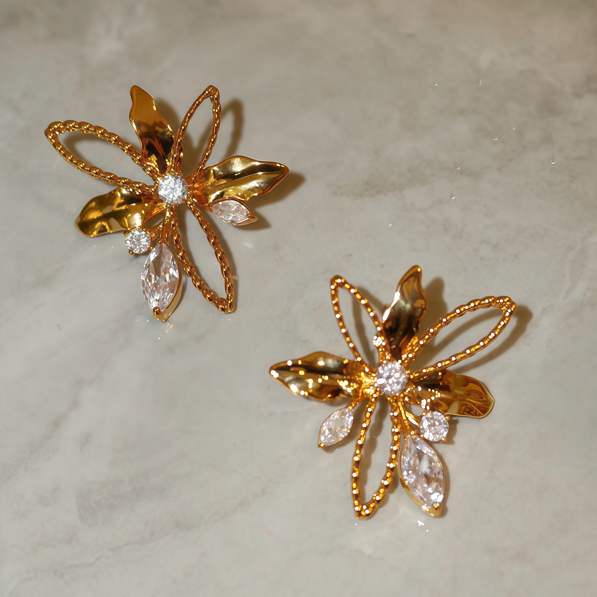Elevate your everyday elegance with the Golden Bloom Ring, a sculptural piece inspired by the delicate strength of nature. Crafted in gold-tone metal, this statement ring features five petal-like elements — some fluid and mirror-polished, others formed by twisted rope loops — radiating around a brilliant center stone. The design is further accented by marquise and pear-cut crystals that add depth, light, and a sense of blooming movement to your fingers.