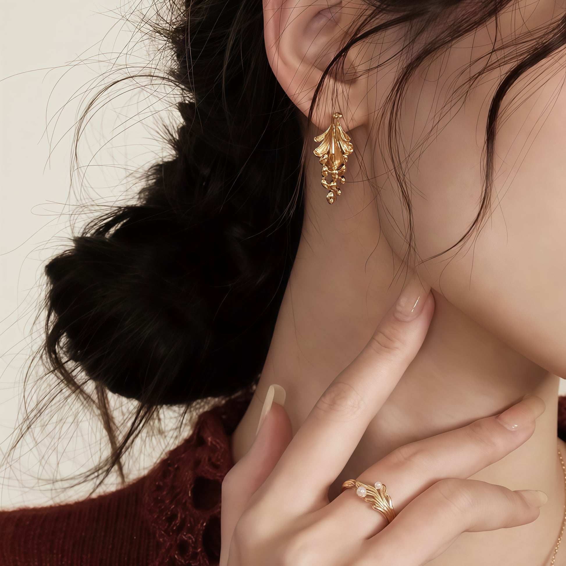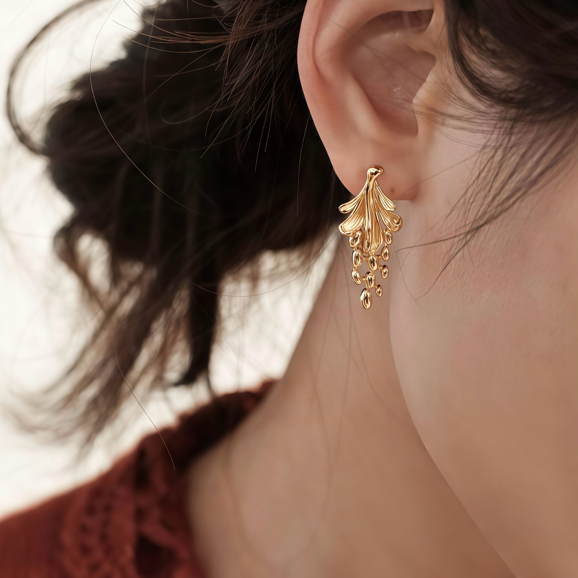 Gracefully sculpted like molten petals in motion, the Golden Cascade Earrings capture the essence of fluid beauty — where form meets poetry. Inspired by the natural rhythm of falling leaves and cascading droplets, each curve and droplet reflects light with a liquid gold brilliance, embodying both elegance and vitality.