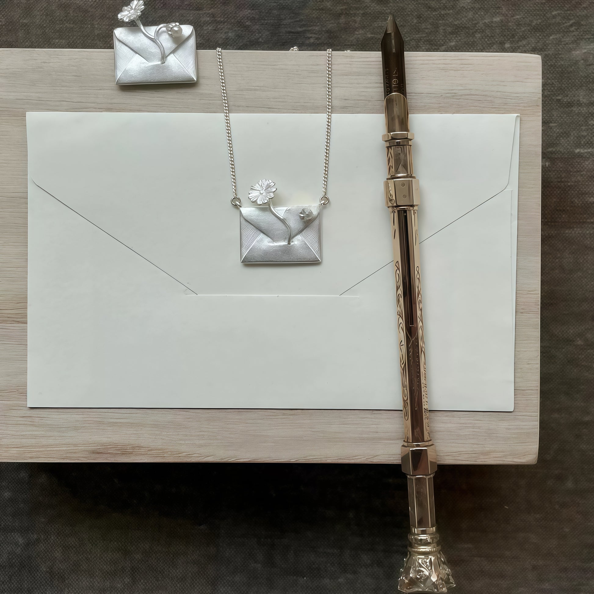 Each piece is handcrafted with delicate texture lines reminiscent of hand-written letters, carrying a soft sheen that mirrors sincerity and warmth. The necklace rests close to the heart, while the brooch adorns your attire like a quiet message — elegant, nostalgic, and timeless.