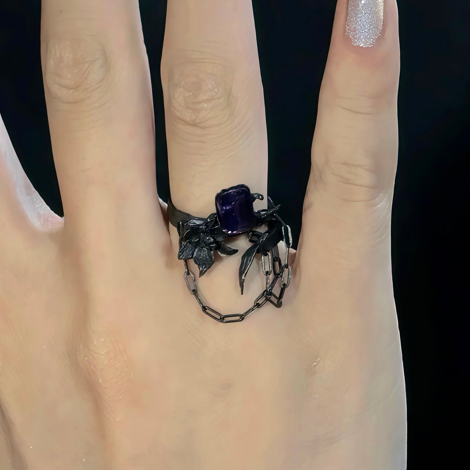 Step into the allure of twilight with our Midnight Orchid Chain Ring, a statement piece that fuses dark romance with artistic craftsmanship. Hand-finished in blackened alloy, this ring features a deep purple gemstone that glows like a hidden flame in the night. Surrounding it, detailed orchid flowers bloom with an air of mystery, while a delicate oxidized chain drapes gracefully across your finger, symbolizing both strength and fragility.