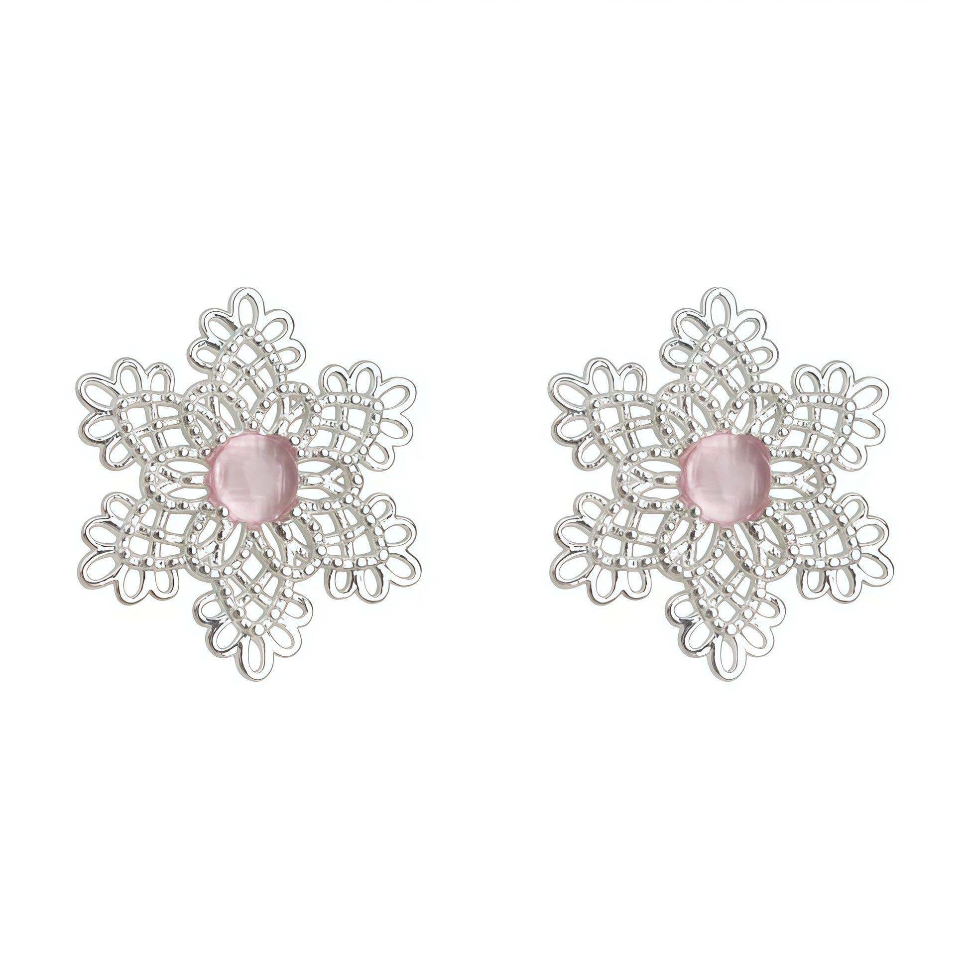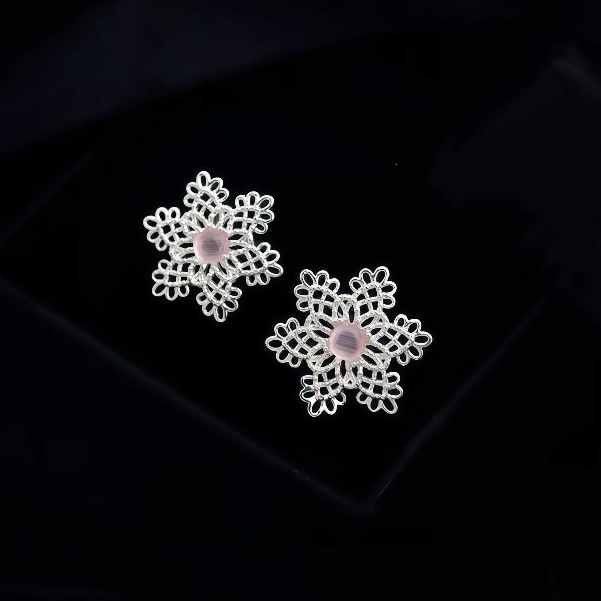 Fleur de Lune-örhängena är fint skulpterade likt en sexbladig blomma kysst av frost och fångar harmonin mellan skörhet och styrka. Varje örhänge är tillverkat med intrikat filigran silverarbete – luftigt men ändå precist – som omger ett milt rosenkvartscentrum som glöder med stillsam grace.