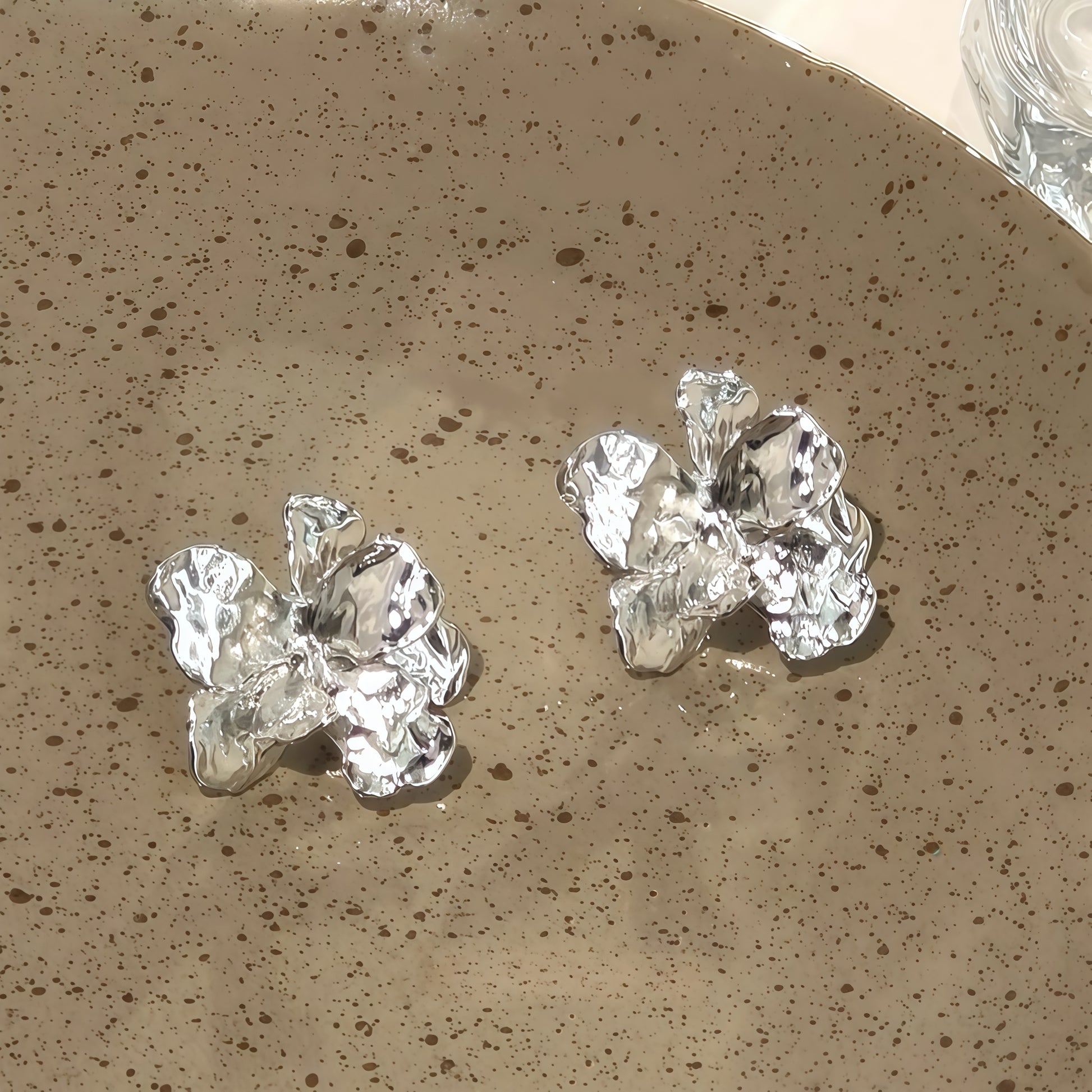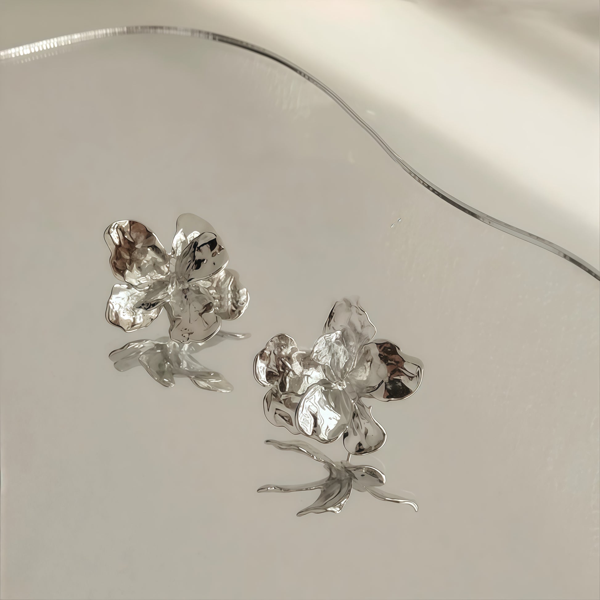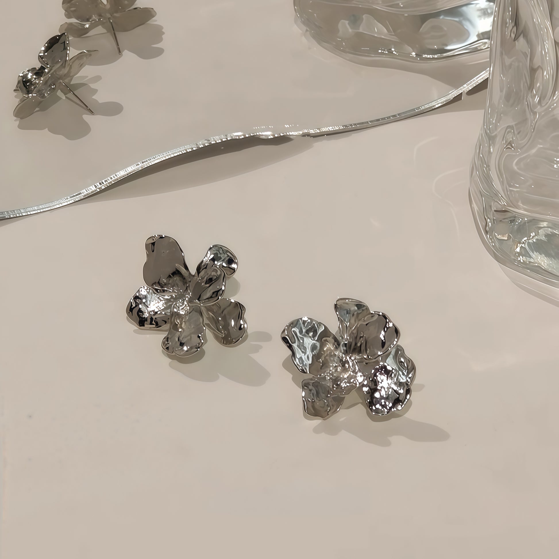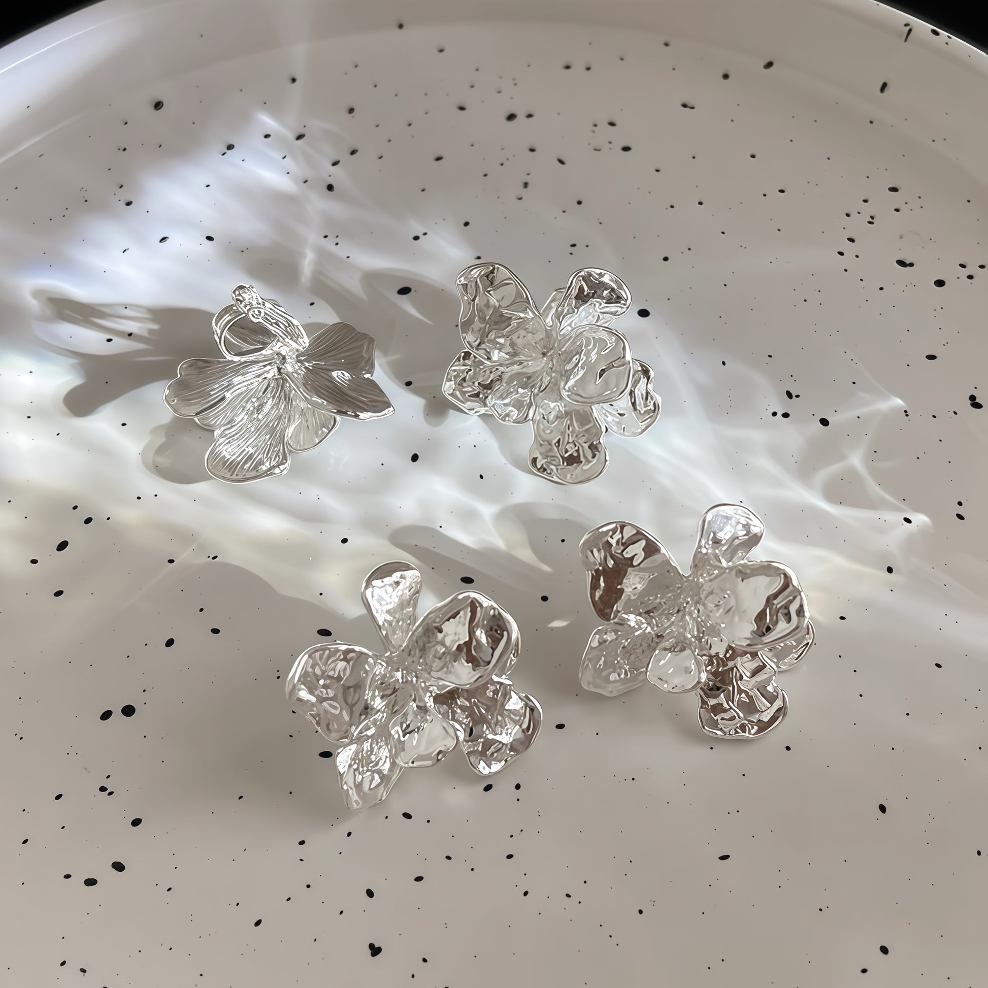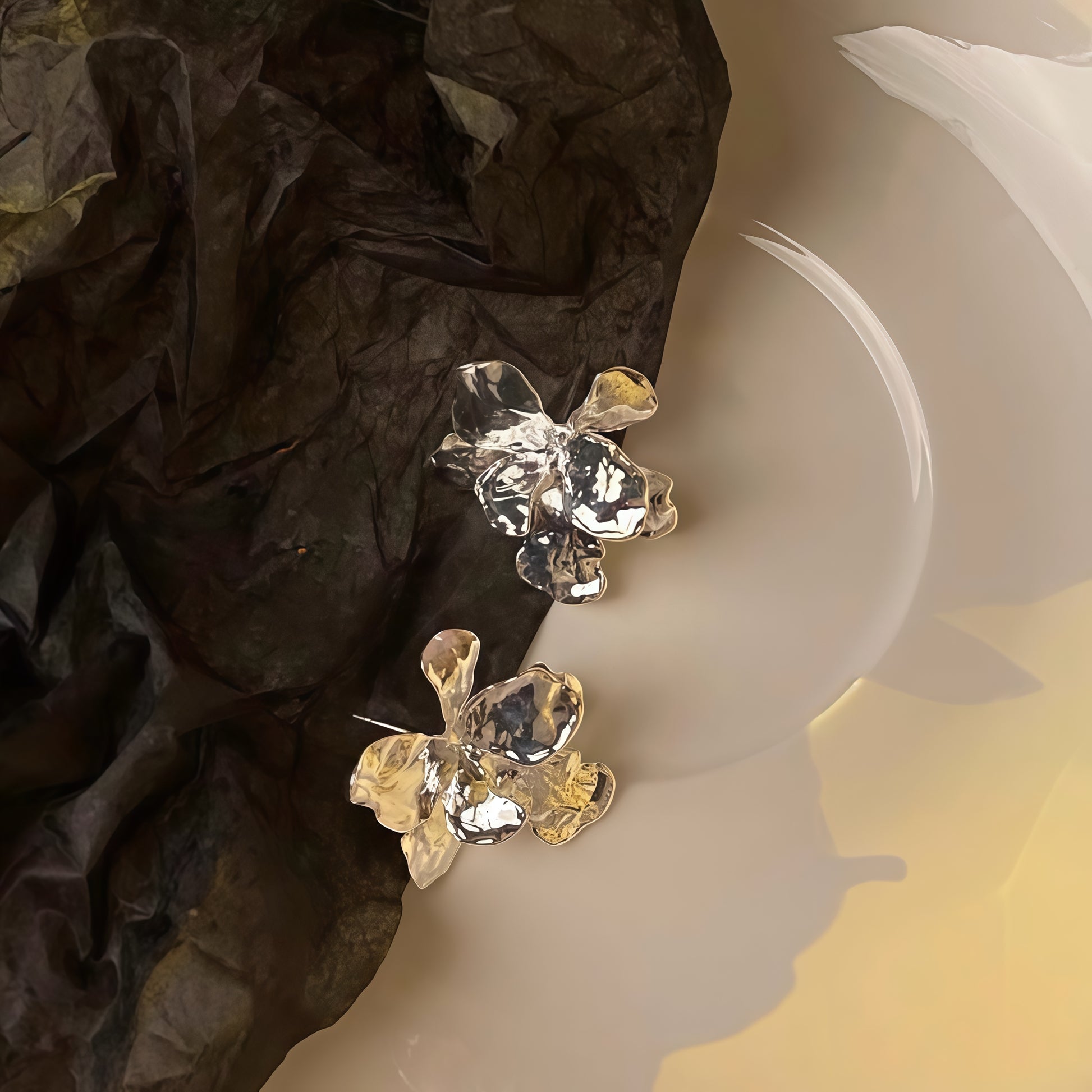 Där modern skulptur möter tidlös elegans. Metallic Romance-örhängena har flytande, kronbladsliknande kurvor med en högblank metallisk finish – finns i både guld och silver. Varje örhänge är unikt gjutet och reflekterar ljus på fängslande sätt, vilket gör dem till det perfekta uttrycket för både dag och natt.