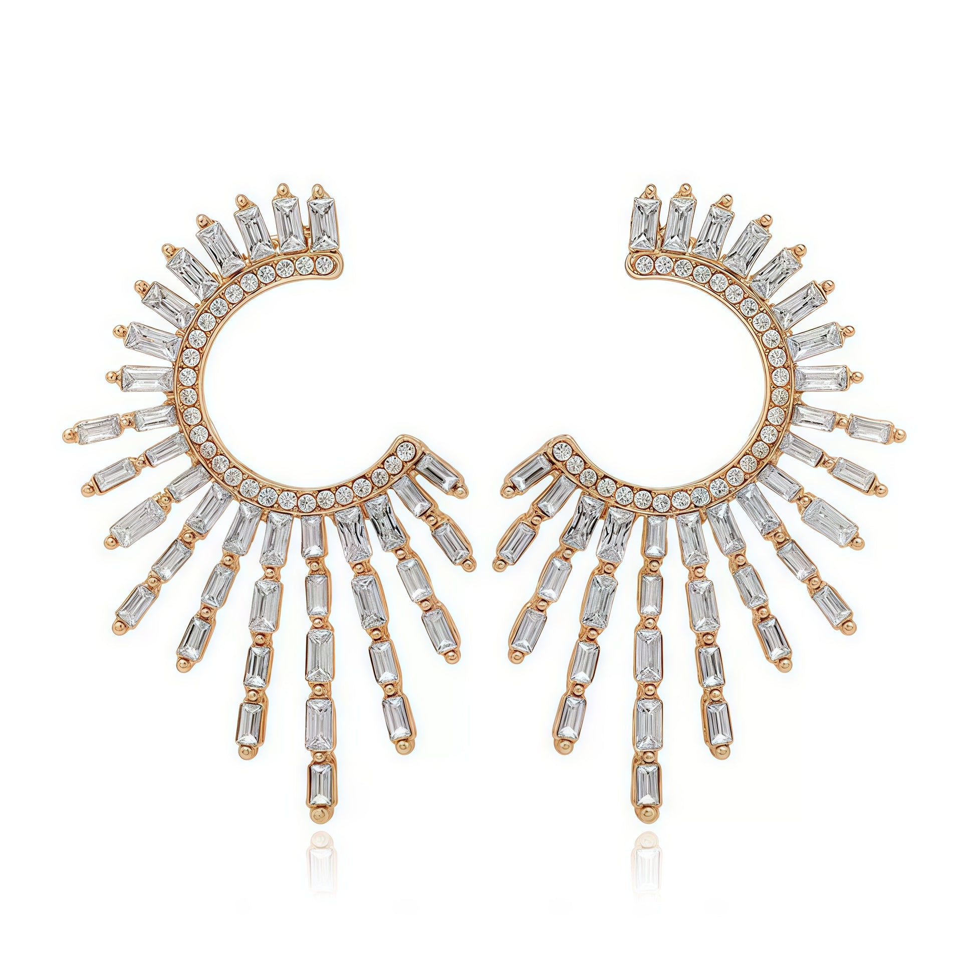 Väck ditt inre ljus med Devine Galaxy-örhängena , en design som sprider sig ur solens briljans. Dessa skulpturala halvmåneformade örhängen är badade i varm guldplätering , omgivna av en gloria av rundslipade kristaller, medan kaskadformade baguettestenar breder ut sig utåt likt strålande solstrålar.